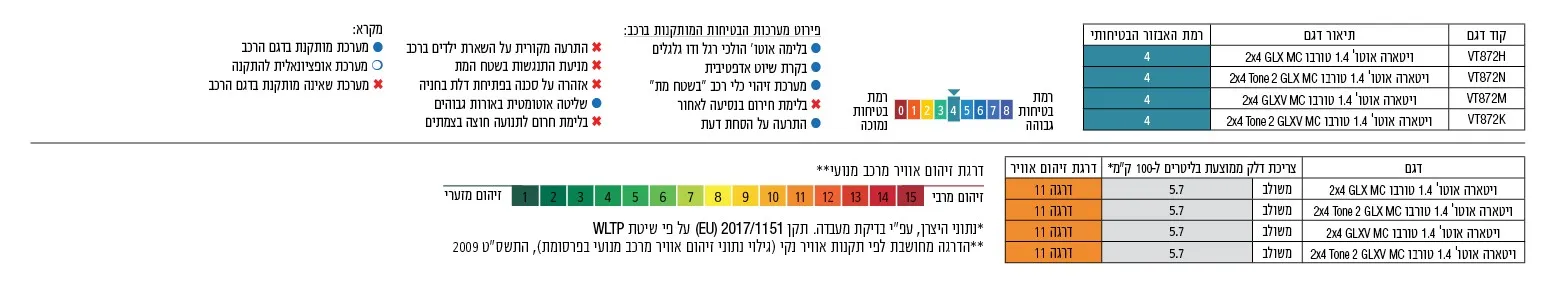 הויטארה הבטיחותית ביותר אי פעם, בעלת תקן האירופי המחמיר GSR הבטיחות כאן היא ללא פשרות שמגיע חבילת בטיחות מקיפה הכוללת 7 כריות אוויר, מערכת בקרת יציבות ESP מתקדמת, מערכת ניטור לחץ אוויר בצמיגים ובקרת זינוק בעלייה. המרכב בעל הקשיחות הגבוהה והמשקל המאוזן מעניקים לכם שקט נפשי בכל נסיעה.