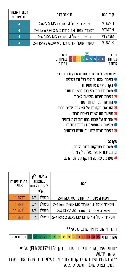 הויטארה הבטיחותית ביותר אי פעם, בעלת תקן האירופי המחמיר GSR הבטיחות כאן היא ללא פשרות ואיתו מגיע חבילת בטיחות מקיפה הכוללת 7 כריות אוויר, מערכת בקרת יציבות ESP מתקדמת, מערכת ניטור לחץ אוויר בצמיגים ובקרת זינוק בעלייה. המרכב בעל הקשיחות הגבוהה והמשקל המאוזן מעניקים לכם שקט נפשי בכל נסיעה.